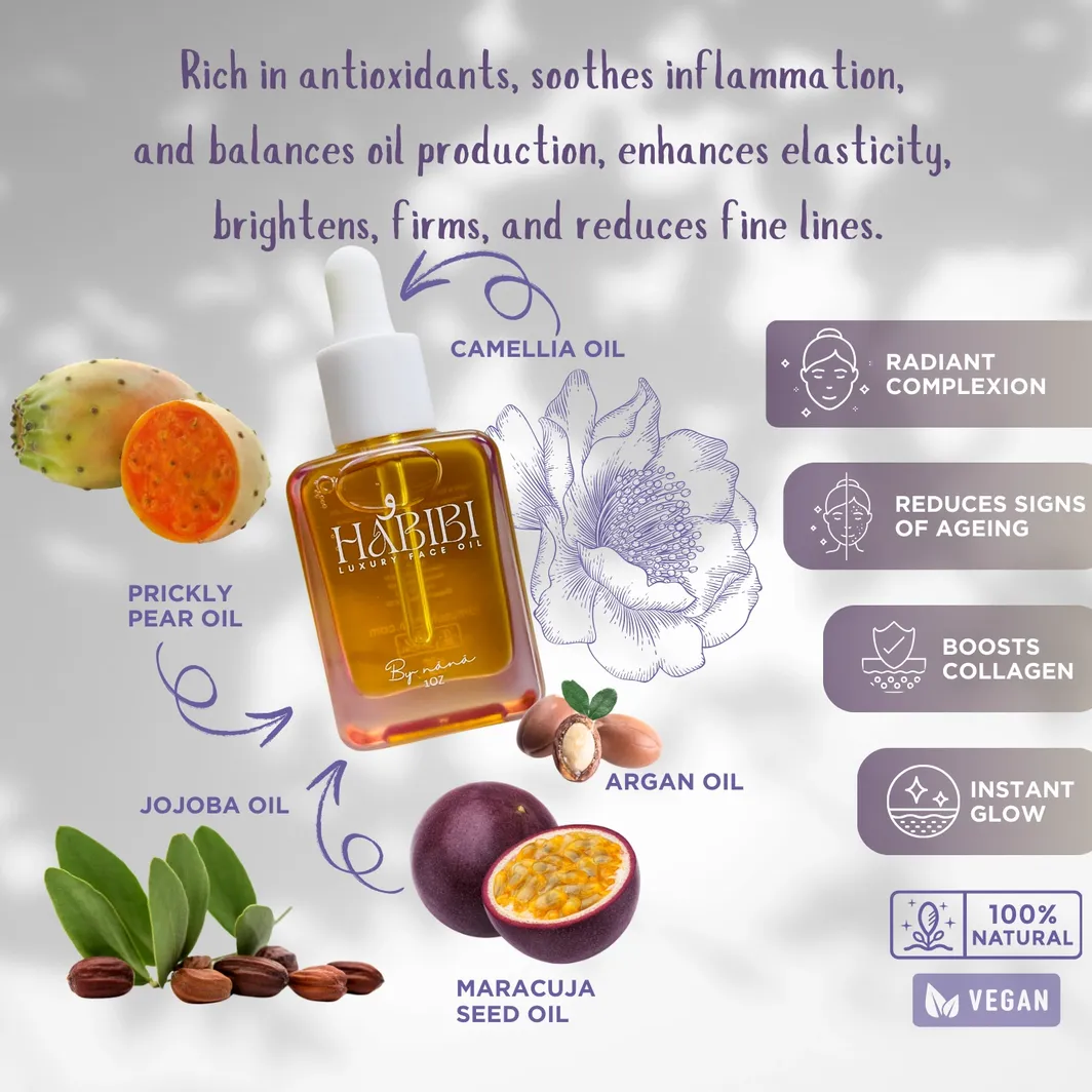 Meticulously crafted, HABIBI Luxury Face Oil gives your skin unparalleled benefits: