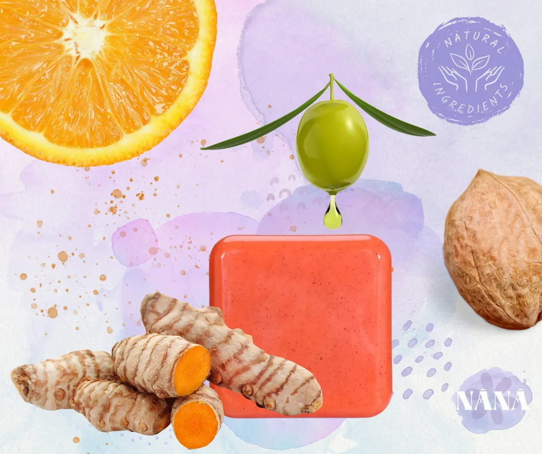 Glycerin, Sorbitol, Stearic Acid, Lauric Acid, Myristic Acid, Propylene Glycol, Lauroyl Glutamic Acid, Sodium Hydroxide, Olive Oil, Water, Trehalose, Kojic Acid, Vitamin C, Sweet Orange Extract, Turmeric, Walnut Granules, Sodium Hyaluronate, Walnut Peel Granules, CI 19140, CI 14700.