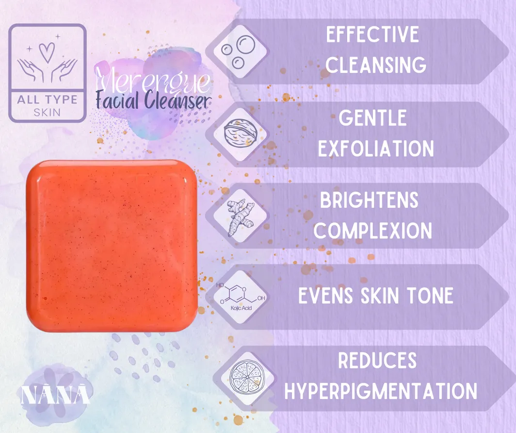 Step into a skincare rhythm with MERENGUE Facial Cleanser, a luxurious scrub soap infused with kojic acid, turmeric, sweet orange, and olive oil. Moreover, this vibrant formula doesn’t just cleanse—it exfoliates, brightens, moisturizes, and protects, making every wash feel like a refreshing dance for your skin.